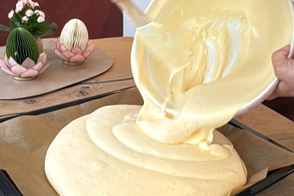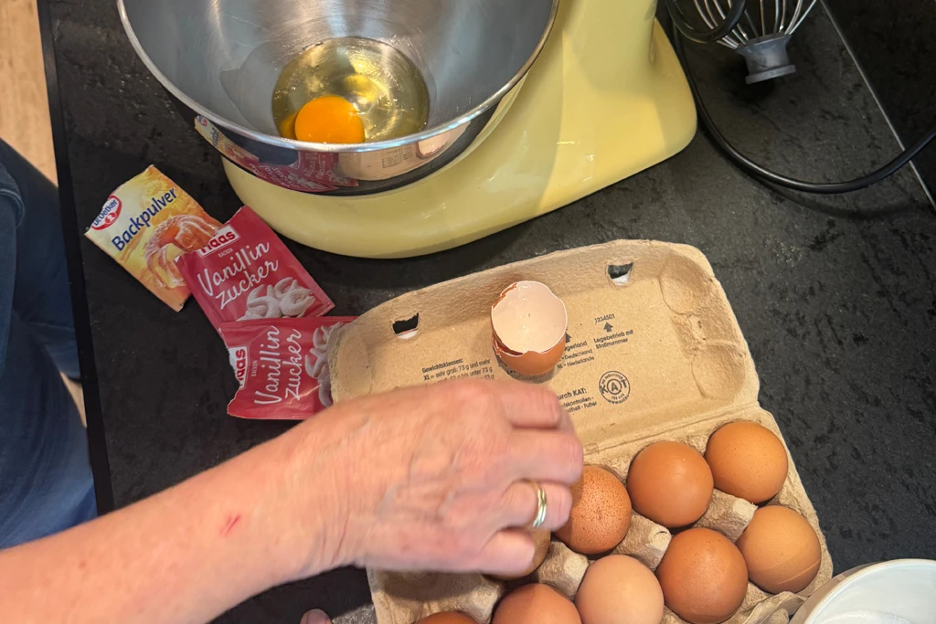 - Die 8 Eier gemeinsam mit dem Zucker und einer Prise Salz ganze 15 Minuten schaumig rühren – das ist entscheidend für die Fluffigkeit!