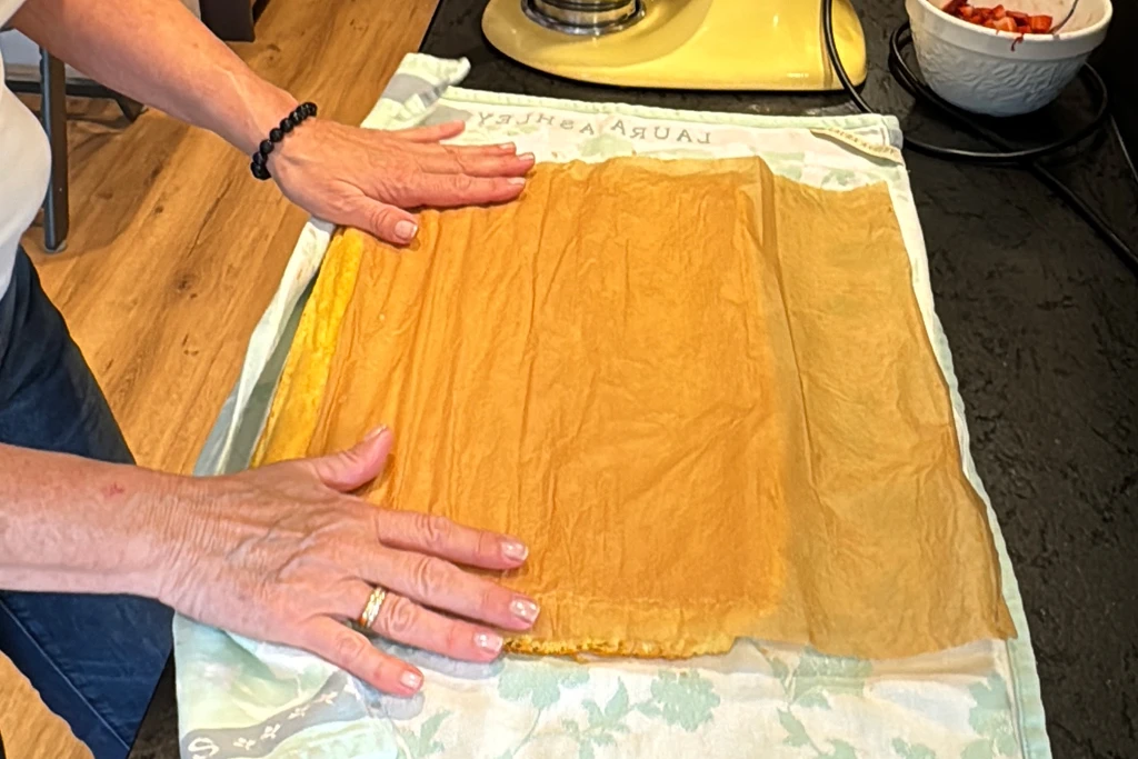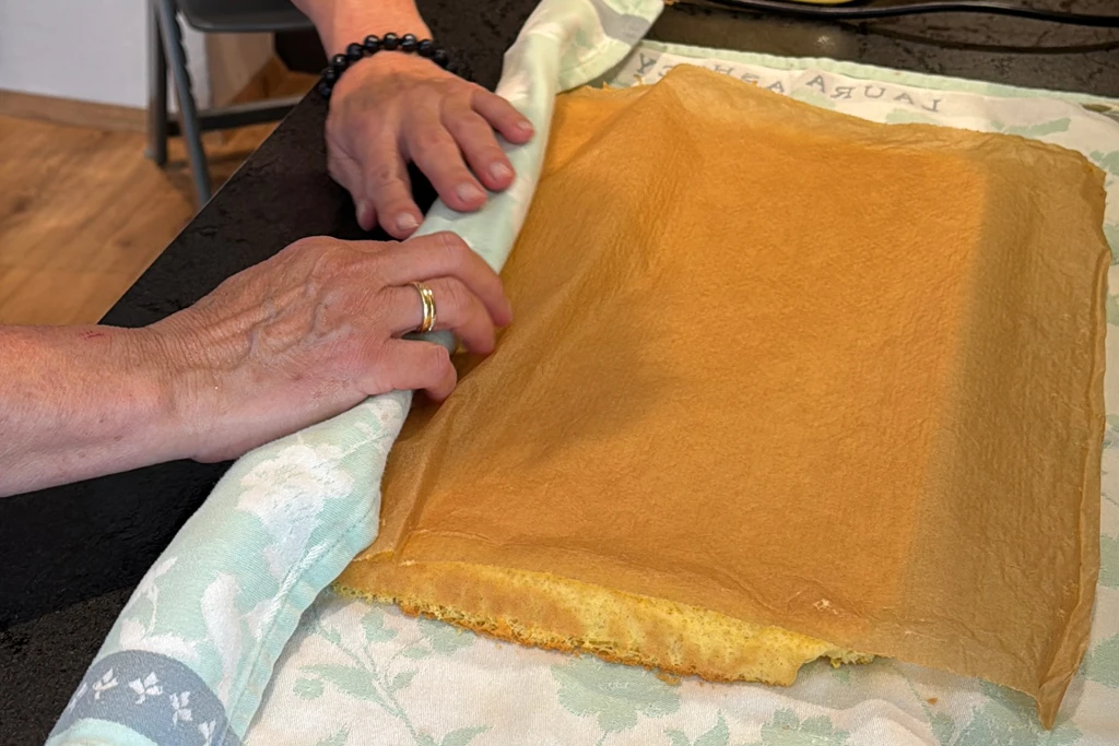 - Dann kommt mein kleiner Küchenkniff: Den Biskuit auf ein vorbereitetes Geschirrtuch stürzen und das Backpapier mit einem feuchten Tuch bestreichen – so lässt es sich leichter abziehen.