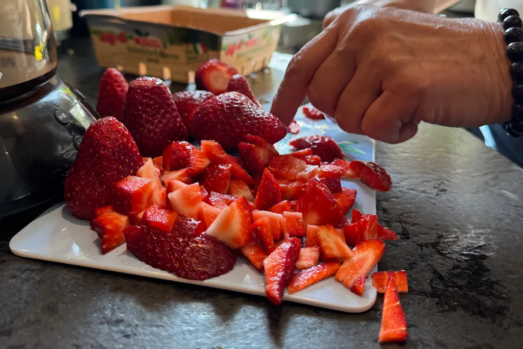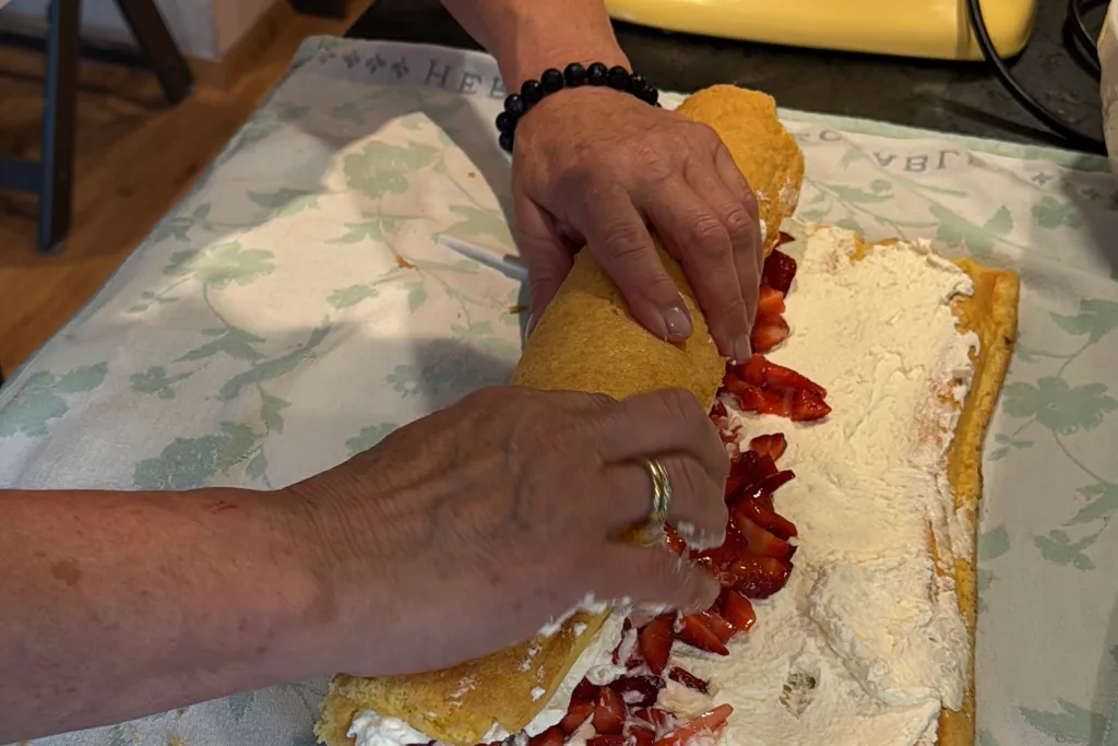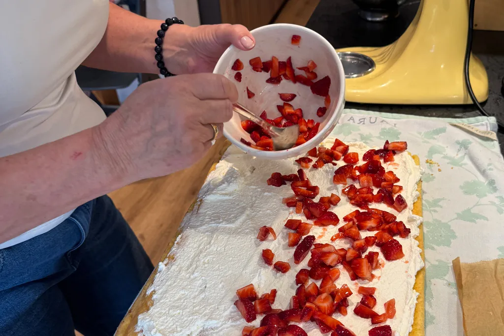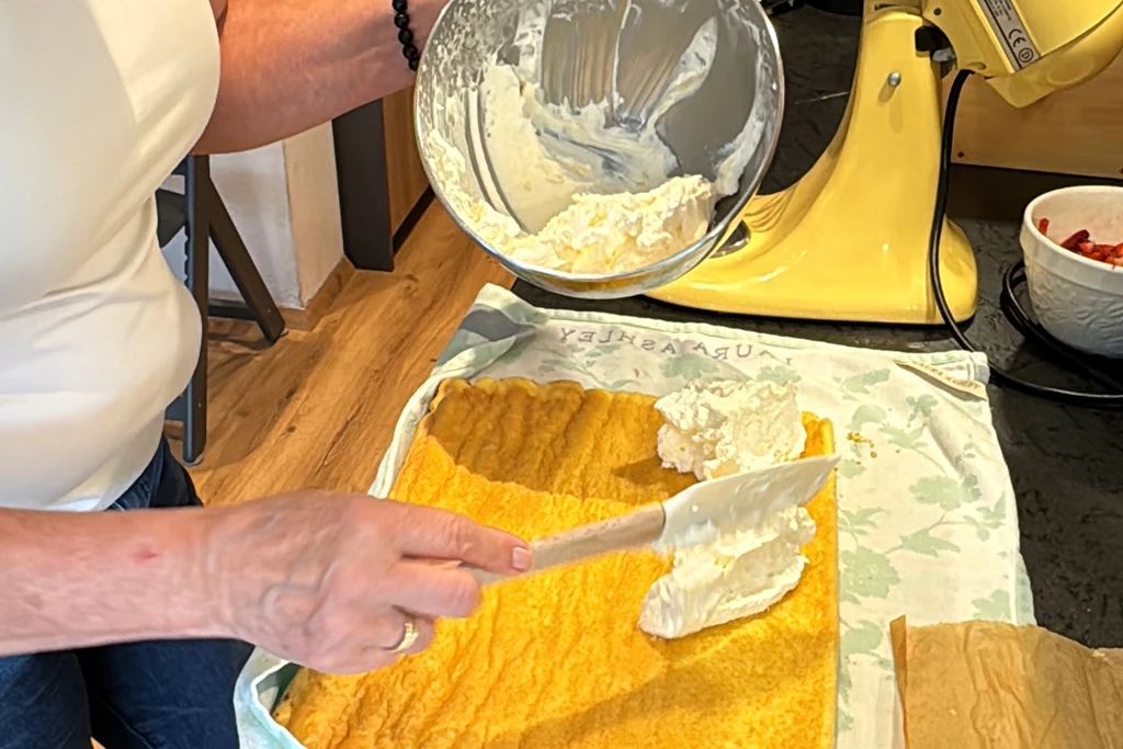 Während der Biskuit auskühlt, bereite ich die Füllung vor. Im Sommer liebe ich die Kombination aus geschlagener Sahne und frischen Erdbeeren – leicht gesüßt mit etwas Honig oder Maracuja. Wer mag, gibt ein Päckchen Sahnesteif für besseren Halt dazu.