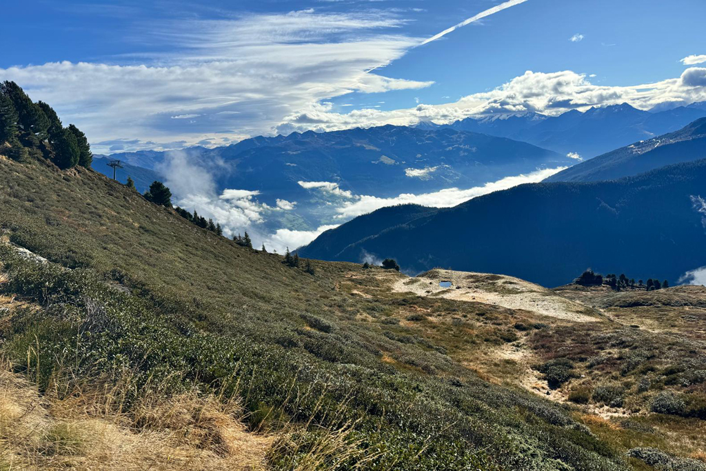 Weiter geht’s Richtung Loassattel. Ein leichtes Auf und Ab bringt uns zu diesem Sattel, wo sich plötzlich der Blick nach Westen öffnet: Tief unten liegt das Inntal, und am Horizont grüßen die Gipfel des Karwendel – solche Ausblicke lassen mein Herz höher schlagen.