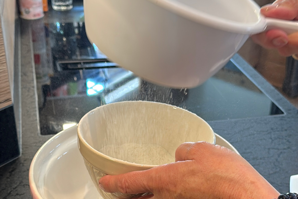 - Das Mehl sieben und vorsichtig unterheben – wer mag, gibt noch einen Esslöffel warmes Wasser dazu.