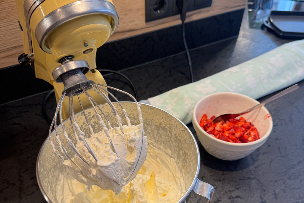 Während der Biskuit auskühlt, bereite ich die Füllung vor. Im Sommer liebe ich die Kombination aus geschlagener Sahne und frischen Erdbeeren – leicht gesüßt mit etwas Honig oder Maracuja. Wer mag, gibt ein Päckchen Sahnesteif für besseren Halt dazu.