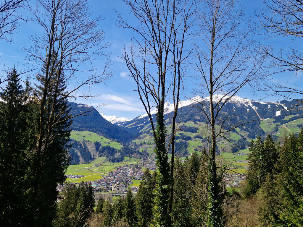 Wir starten wie immer direkt beim Landhaus Zillertal. Von hier spazieren wir gemütlich durch den Ortskern von Fügen – vorbei am Heimatmuseum (Tipp: Hier erfahrt ihr Spannendes über den Ursprung von Stille Nacht, heilige Nacht), dem Friedhof und kleinen Läden, bis wir schließlich den Nachbarort Hart im Zillertal erreichen. Dort geht’s bei der Pfarrkirche los mit dem eigentlichen Wanderweg.